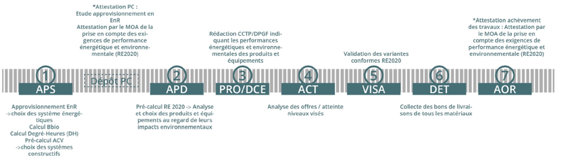 Avant même le dépôt du permis de construire (phase Avant Projet Sommaire), l’étude thermique RE2020 et une pré-Analyse de Cycle de Vie (ACV) doivent être réalisées par un bureau d’études thermiques.